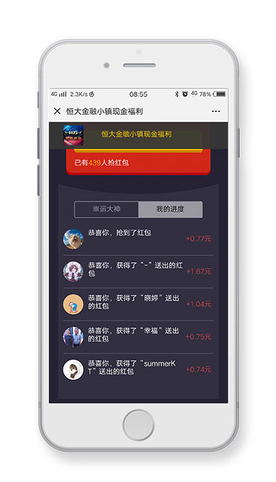 2019年7月恒大金融小镇城市展厅上线举办了“全城送福袋”微信合体红包,此次活动由呼搜网络为其提供微信平台技术支持;本次微信红包活动共投入了5000元的红包金额,活动时长为7天。进入活动界面后,点击抢红包,分享给好友帮合体,合体次数越多,红包数目越大,合体完成指定数目后,点击领取红包,最后公众号会将领到的红包和好友合体的红包一起发到你微信账号下。这样下来吸引到的粉丝数量可是很乐观的。