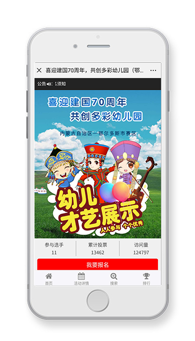 内蒙古幼教协会“喜迎建国70周年,共创多彩幼儿园节目展演”线上投票活动,呼搜网为其提供微信平台技术支持,本次投票活动调动了儿童的积极性,同时向儿童传递了爱国思想。